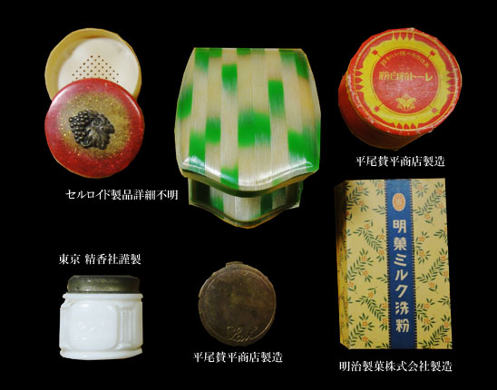 他にレート白粉の金属製コンパクトと紙製パッケージ、精香舎謹製・純植物性ケンシポマードあり。ケンシポマードは愛好者にいまも慕われる名ブランドのようです。そして、少し大ぶりのセルロイド製のコンパクトのデザインと色、細工の見事なこと!明日他にも面白いものが店に入ってくるのが楽しみです。