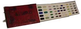 ■下の画像も新着品。こちらは昭和初期の服地・襦袢生地や寝具生地の見本帖です。生地の見本帖というと、通常、三つ折程度の冊子様のものが多いのですが、これはしっかりとしたアルバムで、しかも表紙はバラの花をエンポスでレリーフした立派なもの。一冊に収められた見本生地は約350点。鮮やかな赤や黄色、品のいい日本の古代色など、それらが全く退色もせず残されています。扉に置かれた「商標ラベル」の集合図版も大迫力。同様のアルバムが他に3冊、いずれも表紙の意匠を変えて作られたものが入荷しています。
