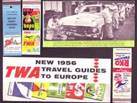 ■風邪、まだ全く抜ける気配なく、しかし熱は上がらないので今週も店は火・木・土曜の12~20時で営業の予定ですが、ご来店に際しては、お出掛け前にお電話で一度ご確認いただければ万全かと。お手数をおかけいたしますが、何卒よろしくお願いいたします。 ■先週は少々難儀な新着品ばかりをピックアップしたので、今週は新着品のなかでも“やわらかい”方面から。上の画像は1950年代の渡航関係資料の一括。例によってエアライン各社のパンフレット類を中心に、「フォード」社工場見学ツアーのリーフレットなども。なかでも拾い物はマッチラベル。旧蔵者はアメリカ各地を巡ったようで結構まとまった量があり、いずれもヨーロッパものとは一味違うポップな味付けが新鮮でした(全てバラ売り)。1950年代、日本からの渡航にはビザの発給が必要だったり、外貨の持ち出しが制限されていたりで、海外旅行は庶民にとって高嶺の花。それだけに1950年代の渡航資料は意外に少ないとも聞きます。日本初の海外パッケージツアー「ジャルパック」の誕生は1964年、その第一陣・ヨーロッパ16日間コースの代金が、それでも67万5千円(!)とあり(ジャルパック商品史より)、当時としては物凄い金額です。以来約半世紀を経て、小店のようなビンボー古本屋でさえ海外に買出しに行ける時代となったわけで、これは本当に有難いことではありました。もっともこうなると、いくら渡航資料を残しておいたところで有難いものではなくなるんですけどね、百年くらい待たない限り。