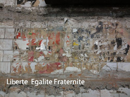 レンガの上にポスターが貼られ、タイルで覆われた後コンクリートで固め、その上に広告が描かれたり、ポスターが 貼られたりして、でもそれを剥がすでもなく上からまたペンキを塗って…と、まるで地層をなすがごとき都市の時間の堆積がそこにありました。そんなものがひょいと顔を出しているのが何とも面愉快で、見方によっては美しくもあり、また、一面怠惰と云えるようなこの大らかさが、世界中のあらゆる人・モノ・コト飲み込んできたパリという都市のある種の寛容に繋がっていたのではな いかと、とても好ましくも思えたものでした。