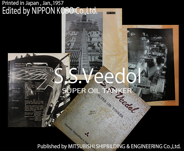■何を思ったのか石油タンカーの本です。苦し紛れ、と云えるかも知れない石油タンカーの本であります。『S.S.Veedol - SUPER OIL TANKER』。1957年、アメリカのタイド・ウォーター・オイル社発注の大型タンカー「Veedo」と「Wafra」2隻の建造を機に、三菱造船がその技術と施設とを海外にアピールするために作成した全編英文による上製本。企業PR用の印刷物というのは一般に出回らない上に、これはさらに海外向けとあって、なかなかお目にかかれないのも道理と云うもの、戦後の発行ではありますが珍しい本(…のはず)で小店初の入荷です。もっとも、石油タンカーの本がそう度々入荷する古本屋というのがあったら、そちらの方が珍しいのですがそれはさておき。