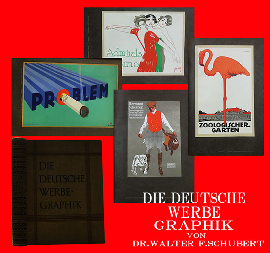 戦前ドイツのグラフィック・デザインで筆頭に挙げられる人がルートヴィヒ・ホールヴァイン。後にナチス党員となり、プロパガンダでも活躍したホールヴァインの、ここでは至って穏当な仕事を巻頭カラー図版に多数とり、続いてルツィアン・ベルンハルト、ユリウス・クリンガーと云う超一流どころの作品をおさめ、 さらにルイス・オッペンハイム、ユップ・ヴィールツ、パウル・ショイリヒ、ユリウス・ギプゲンス、ハンス・イベなど、とくに第一次大戦後のドイツ・グラフィック・デザイン、コマーシャル・デザインの第一線で活躍したアーティストのポスターを中心に、その代表的な作品を網羅。刊行当時はちょうど世界的にもポ スター芸術の黄金期と云える時代にあたりますが、この当時のドイツのグラフィック・デザインをおさえるためのマスターピースのひとつと云える、とても充実した内容の1冊です。