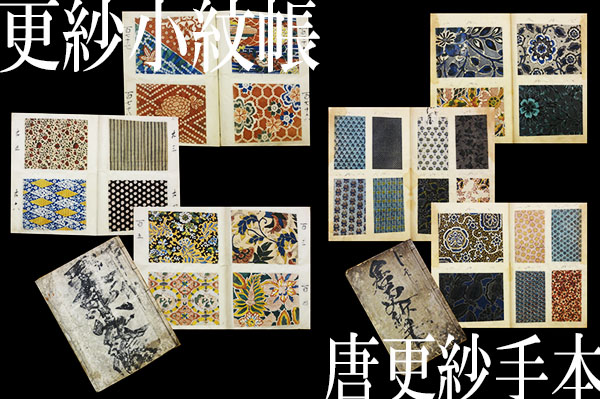 ■画像には入れていませんが、臙脂色の布を貼ってこのために誂えられた夫婦箱に大切に収められていたのが本日の画像3点目の2冊。こちらは主にステンシルの手法によって忠実に図案=意匠と色彩とをかたどりした、云ってみればテキスタイル・デザイン集(図案は全て別の紙に写したものを切り抜いて糊貼り)。明治初期頃までには成立していたものと見られます。