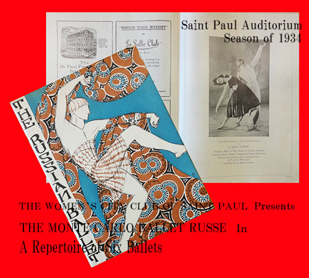 少し前、と云ってもよく考えれば10年ほど前までは、それでもまだ年に1度位は市場で目にしていたような気がするバレエ・リュスのパンフレットも最近は全く見なくなりました。今回入荷したのは残念ながらディアギレフ没後、バジル大佐が率いたバレエ・リュス・ド・モンテカルロのもので、1934年、アメリカはミネソタ州の婦人クラブが招聘した公演のパンフレットです。従って英文。2月12日から14日までの3日間・4公演で6演目。ディアギレフのバレエ・リュスから継承したプログラムはレ・シルフィード、白鳥の湖、カルナバルの3つ。カルナバルではバクストの舞台美術を使用していたようです。また、1933年に制作され、レオニード・マシーンの振り付けでモンテカルロの代表作となった「美しきドナウ」が3公演でプログラムに組まれている他、ドラン作、オーリック音楽、バランシン振り付けの作品なども。