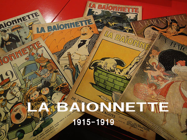 『ラ・バイオネット』はご存知の通り、第一次世界大戦中の戦意高揚を意図して出版されたフランスの週刊誌。薄冊で、しかも新聞紙のようなどちらかと云うと 粗悪な紙を用いながら、カラー印刷を多用。何より、ポール・イリブ、セム、スタンラン、ヴェーゲナー、イカールなど、往時の人気イラストレーター多数が作品を寄せた結果、戦時の世相・風刺を描きながら、時代を超えて評価される雑誌となったものです。入荷したのは創刊年である1915年より終刊年である 1919年までに発行された全234号の内の59冊。保存の難しい性格の雑誌ですが、旧蔵者のお陰か全体に良好な状態が保たれています。