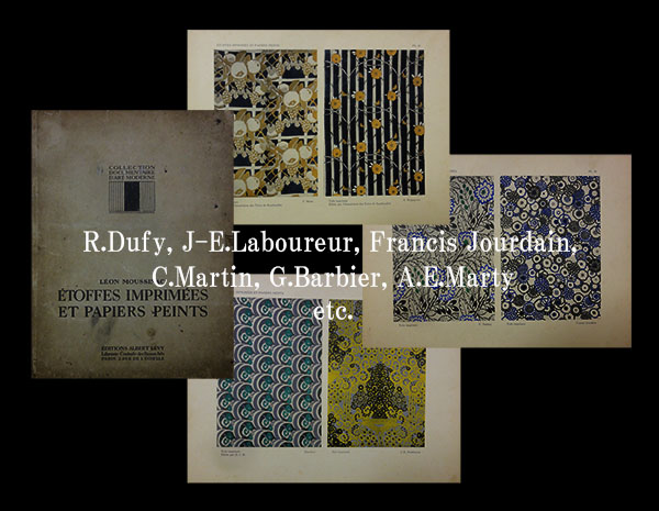 単色印刷分含め47葉は、そのほとんど全てがアールデコ様式と云えるもので、デザイナーとしてクレジットされている名前を見れば、ラウル・デュフィ、ラブ ルールといった画家からマルティ、マルタン、バルビエといった往時のイラストレーターまで、これはもうまるで『ガゼット・デュ・ボン・トン』はじめ、当時の高級モード雑誌のラインナップに等しい面々。インテリアへの「流行」「時流」の導入も、ここまでくれば堂に入ったものと云えましょうか。