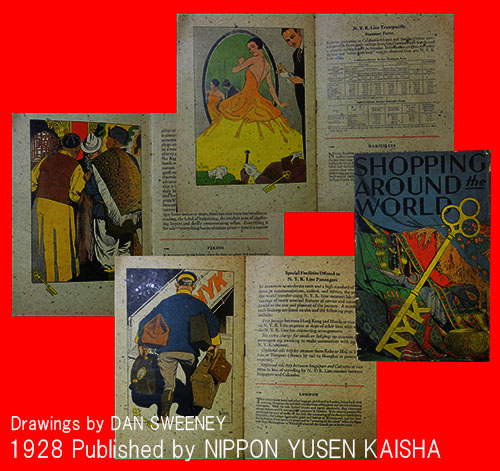 『SHOPPING AROUND THE WORLD』。タイトル通り、ヨコハマ、京都、韓国、ペキン、上海、ホンコンからハワイ、カルカッタ、ロンドン、マルセイユ等々、日本郵船の寄港地にのっとりつつ、世界中のお買い物事情について 英文と、日本人のセンスとは一味異なるイラストとで紹介していく内容。全文英文で書かれている日本郵船の対外宣伝物のひとつです。