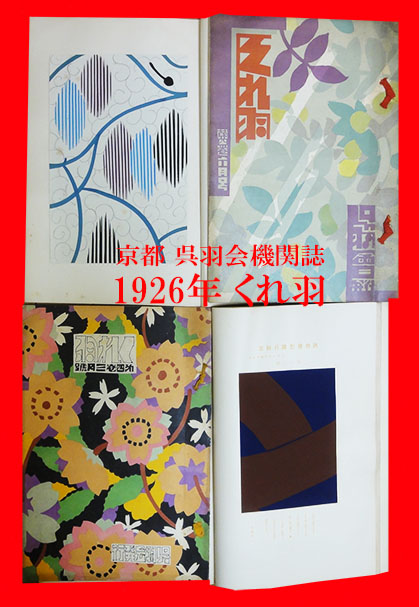 発行元となっているのは京都の呉羽会。京都高島屋、大阪高島屋、大阪大丸、大阪三越、大阪松坂屋、大阪十合、京都染織学校、京都高等工芸学校などが会員となっており、ぞれぞれ意匠家、研究者、指導者等が寄稿。但し、主眼が置かれているのはキモノのテキスタイルデザインにあり、この色調をより正確に伝えるために、本文ページには、実作品の生地サンプルもしくは石版画、手彩色画など再現性の高い印刷手法によって作成された別刷が豊富に貼り込まれるスタイルがとられました。結果、いま見ても銘仙を思わせる大胆かつモダンなデザイン・色使いが多く、大正末期の流行をよく表しています。