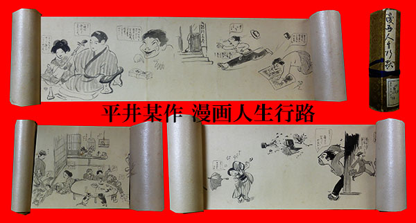 ■画像は平井某氏作とされる肉筆巻物『漫画 人生行路』。大学はでたけれど就職難、たまたま買った証券が高騰したかと思えば蕩尽し、肉体労働を余儀なくされ、しかしお見合いを勧められ一緒になると、いまは子だくさんに何故か飼い犬飼い猫鳥にネズミまでいる大家族。山越え谷越えたどり着いたささやかだけれどほほえましい生活風景を巻ものに仕立てた一巻。いまはもう苗字以外作者については何も分からない人の手になるものですが味のある良い絵なもので。無名のものは売れないと痛いほど分かっていながら、おもしろくって、つい。