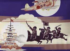 ■同日落札のその②は、額装されていた戦中の着物の生地。男の子用のものです。軍艦が波をきって進み、馬上には意気軒昂な兵隊さん、ここには写っていませんが、右下では戦車が土埃を上げています。そして上空に見える飛行機には「愛国」の文字。これを額に入れていたセンスもよく分かりませんが、しかし、「美しい国」といいながら水の流れがあればダムを造り、赤字だろうが何だろうが縦横無尽に道路を通すセンスというのも不可思議です。そして「愛国」。かつてこの言葉が、かように使われていたのだという証左のひとつがこの着物だといえるでしょう。言葉の本来持つ重みが、いまほど軽く扱われた時代を知りません。この着物に残された「愛国」と、2007年現在どこかの誰かが考えているらしい愛国との間は、もうすでに目と鼻の先に迫っているのではないかと考えるのは、単なる杞憂に過ぎないのでしょうか。昨年の防衛庁の省昇格、教育基本法改正をも含め、せめて、歴史の変節点にいるのだということには自覚的でいたいと思います。この着物は、今日だから買う気にもなった、我が心に打ち込む「杭」のような一点であります。