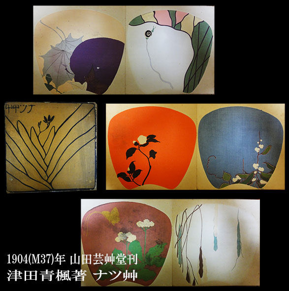 団扇のデザインに限定されていてあまり受けなかったのか、特殊な判型のため残りにくかったのか、『ナツ艸』は小店店主初見でした。珍しい。はずである。がしかし。落札できた途端に俄かに不安に襲われるのも市場で古本屋が味わう不思議な心理でありまして、偶か近くにいたこの手のものに強いご同業何人かに確認してみたところ彼らも揃って初見とのお話し。芸艸堂には青楓の木版刷図案集が複数あり、最近にはそれらの図案をまとめ直した『津田青楓の図案』という本も発行されているのだけれど、その目次にも『ナツ艸』の記載なし。やはり非常に珍しい本であろうと思います。
