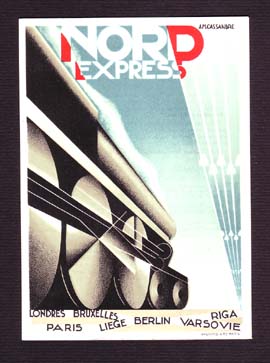 ■「アンダーグラウンド・ブック・カフェ」の目録の締め切りに、4/28(土)に立ち上がるジェオグラフィカさんのアニバーサリー・フェアにあわせた特集コーナーの準備が重なり、今更ながらに慌てつつ、しかし来週も店は火・木・土曜の12時~20時で営業いたしますので、どうぞ遊びにお出でください。 ■今週、パリから待望の3点が届きました。どれもカッサンドルの紙モノ。先ずは上の画像、ポスターではよく知られている「NORD EXPRESS」ですが、こちらは大ぶりのハガキくらいの広告用印刷物。ですがもちろんリトグラフ。裏面には料金など乗車案内が印刷されています。ポスターが発表されたのと同じ1927年頃のものでしょう。ポスターでは図版の周りに配されていた文字が省略されている点を除けば、ポスターと同じデザインです。カッサンドルならではの「このパーステクティブを見よ!」といった構図にあふれる緊迫感は、サイズに関わらずここでも健在。列車の車輪の上に引かれた細く白い線など、いかに計算されたデザインであることか!…などと手にとってつぶさに眺めれば眺めるほど、実は売りたくなくなって困ります。オークションで何とか手に入れたのですが、しかしそれにしてもカッサンドル、高くなったもんだ…。
