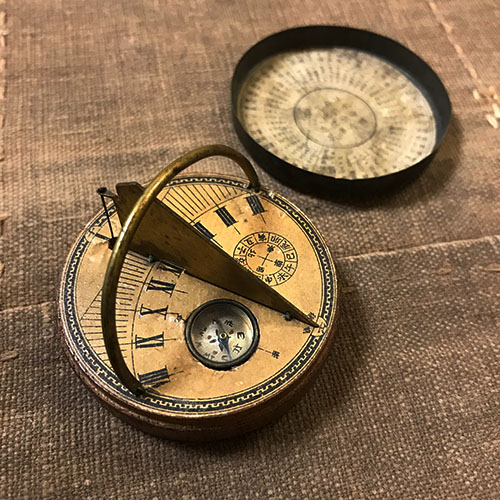 ■画像はこの連休中に出かけた骨董市で購入した「懐中式日時計」。齢ウンじゅうウン才にして初めて存在を知ることになったもの。蓋の裏には日本全国「府県庁所在地標準時之差異」まで貼り込まれていて、なるほどよくできているなと感心。こちらは小店店主の個人コレクションにしてしまおうかと思案中。見せびらかしてすみません。下に敷いた酒袋は近日中に販売の予定。