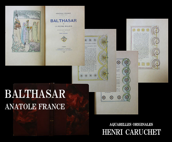 こちらももちろんアナトール・フランスの著書で、1900年に発行された『バルタザール』の挿絵入り限定50部本の内25番。挿絵については「aquarelles original」=水彩画用オリジナルと記載していますが、描線の部分には何かしらの版画或いは凸版印刷が用いられているものと見られます。