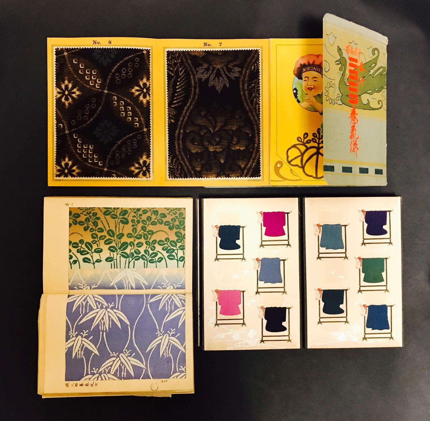 上段は『登録商標ニコニコ意気絣』というブランド名もふるっているキモノ生地見本帖。このタイトル、そして、ニコニコ笑ってはいるもののどこか不気味な少年キャラクターも非常に魅力的ですが、こちらの主役はあくまで、渋いけれど大胆なデザインが特徴の29点の生地現物であります。折帖仕立てのこの製本装丁センスも楽しくてよろしいかと。無刊期ですが、大正頃のものではないかと見ています。