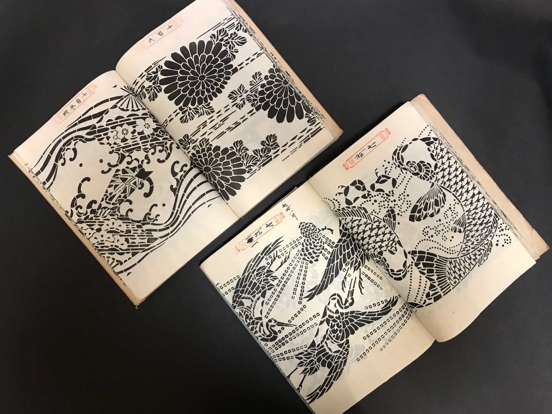 ■すでに申し上げました通りネタは良いのでもうひとつ ! 染物の型紙の台帳2冊。上段のには『紅板締 新模様 清印』、下段のには『紅板新柄 巴印』と表題あり。いずれも京都の染屋さん (下段は北村又治郎さんのところ)の旧蔵品。