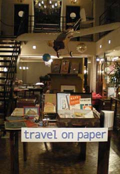 ■GW中の営業日のお知らせです。今週4/28(土)、来週5/1(火)、5/3(木)の各日12~20時で営業いたします。連休の谷間のようなところでの営業でご不便をおかけいたしますが、どうかご来店のほど…。 ■小店の商品を置かせていただいている目黒・ジェオグラフィカさんでは、4/28(土)~5/13(日)の期間、アニバーサリー・フェアが開催されます。昨晩は私も陳列作業にお邪魔してまいりました。「Travel on paper」をテーマに、旅にまつわる古書・紙モノから新刊書籍、CDなどの特設コーナーの他(画像参照…天井からは飛行機が!)、テーマにあわせた講座や家具のソルド(なぜにウチは六畳一間?? 欲しいモノはいっぱいあるのに。しかも思い切り安いのに)まで、企画が盛りだくさん。力、入ってます。お買い上げの方には特典も。連休中は是非ジェオグラフィカさんへ!! ■さてさて今週の新着、ですが時間とスペースの関係で一点だけ。こりゃタダモノではないぞ。でもロシア語、全然読めないし。というのでこの二年ほどじぃーっと手元に置いていた本がありました。先日ご来店下さったロシア語に通じたお客様のご協力で実にあっけなく判明(私の二年間は一体…??)。マヤコフスキーの戯曲『南京虫』をフェリチェスカヤ女史なる人の絵とタイポグラフィによって視覚的に構成した本なのでした。1974年に当時のソ連で発行。粗末な紙ながら