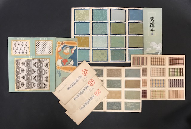 『裂地標本』が「松」と「竹」の2点、『表装裂地絹桟見本』が「松」「竹」「梅」に「芳」「佳」の5点。いずれも戦前の古いもので、1点につき12点または24点の生地現物が貼り込まれています。