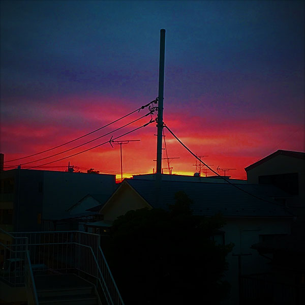 ■画像は28日黄昏時の空を染め上げた燃えるような夕焼け。こんな夕焼けの後だというのに、いまはもう、雨の音が聞こえてきています。