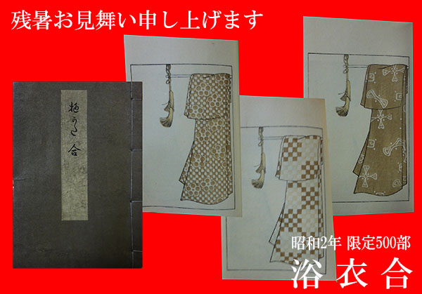 ■残暑お見舞いに添えた今週の画像1点目は木版刷の図案集『浴衣合』。昭和2(1927)年に稀書複製会より500部限定で発行された非売品です。16×11cmの小さな和綴じ本で、色は茶色の濃淡のみ、それに白の空刷りを組み合わせ、なおかつ全て同じ構図で配置した禁欲的な図版36図を所収。画像ではお伝えするのが難しい白の空刷り部分はとくに見事です。余計なことを一切しなかった結果なのか、とても「ゆかた」のものとは思えない品良く格調高い図案集となっています。