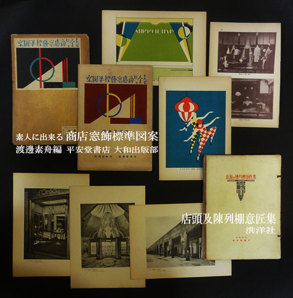 さらにもう1冊、『素人に出来る商店窓飾標準図案』は装飾部分のデザイン画と優秀例の写真とで構成されたお手本集。渡邊素舟が編者をつとめました。プレート欠けはあるものの、ポートフォリオと扉は木版多色刷、収録された作品もなかなかです。現品では確認できず、書誌データにあたってみたところ、昭和2(1927)年の発行。こちらもまた、アール・デコの影響著しいデザイン集です。