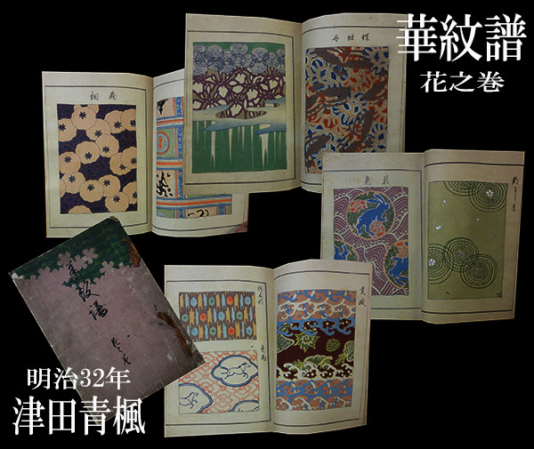■現代人にとっては少々読み辛い文字でタイトルとして『華紋譜 花之巻』と表紙に書かれておりますこちらはと云えば、明治32(1899)年に京都で発行された津田青楓による木版刷の図案集。和綴じ40ページに、48図を収めています。