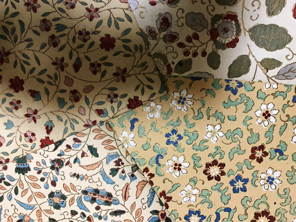 ■画像は唐紙のサンプル。バラバラの状態で入荷したため、1枚ずつの販売です。なかに更紗と見紛う唐紙が結構な枚数あって、この手のデザインは小店も初めて。比較的古いものだと思いますが、なかなかすぐれたデザインの見本帖だったようなだけに、バラけてしまっているのが惜しまれます。