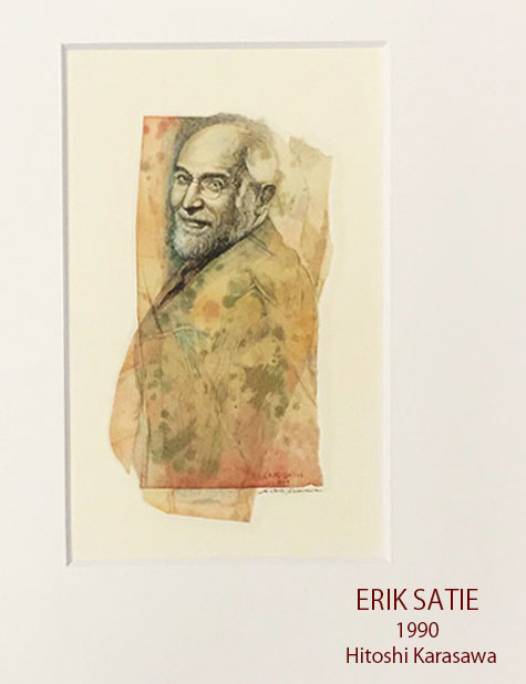 作家は木口木版画で夙に知られる柄澤齊。版画に手彩色かと見れば、鉛筆画に水彩で色染めした薄い和紙を貼り合わせたコラージュ作品。鉛筆による描線は木口木版同様に細密かつ繊細ですが、木口に比べるとずっと柔らかくやさしい印象を与えます。画面右下方に「ERIK SATIE 1990 Hitosh Karasawa」と記された1点もので、版画ではなく1点ものだというのも気に入りました。