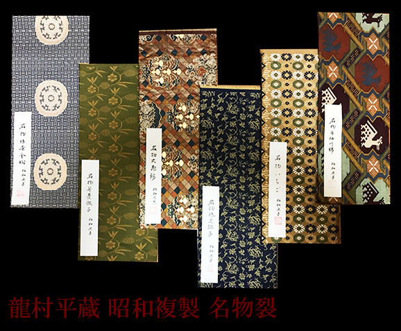 ■できれは少しは関連のあるものをアップしたかったのですが、何の脈絡もない2点目は、「龍村平蔵製」の銘と落款が入ったタトウに1点1点包まれた名物裂。昭和35年前後、と云うことは初代の龍村平蔵の時代にあたるのですが、その初代平蔵が生涯熱心に取り組んだ古裂・名物裂の研究と復元の成果として複製し、限られた人に頒布していたものと見られるシリーズの内、19点が入荷しました。いずれも和の意匠でありながら、ユニヴァーサルなセンスをもつ意匠のオンパレードです。