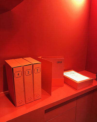 ■入り口入ってすぐの平台の上を入れ替えました。未来派の「宣言」を中心にエフェメラを忠実に複製し、年度ごとにポートフォリオに入れ、そらに函に収めた4函の揃い。これだけのオリジナルを蒐集するには一体いくらかかるのかと考えれば、複製は有難くもある存在に違いありません。