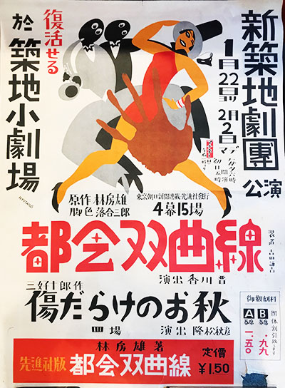 ■店は来週も火・木・土曜日の各日12時より20時で営業いたします。ご来店、よろしくお願い申し上げます。 ■画像は新築地劇団による公演のポスター。海外の強い影響を思わせるイラスト、特徴的な手描き文字で構成されたポスターは吉田謙吉に師事した三林亮太郎のデザイン。洒落てます。「吉田謙吉と12坪の家」、LIXILギャラリーで始まってます!