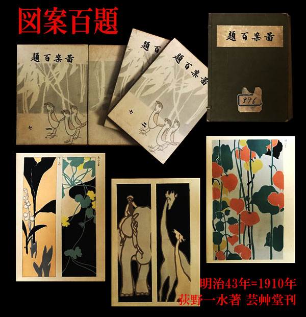 著者の荻野一水は以前『応用漫画』の著者として当HPでもさらりとご紹介したことがありますが、明治の後期、もっぱら芸艸堂または山田芸艸堂から木版刷の図案集を刊行していた人。但し、その出版点数は決して多くなく、また当人に関する情報も非常に乏しく詳細は不明。