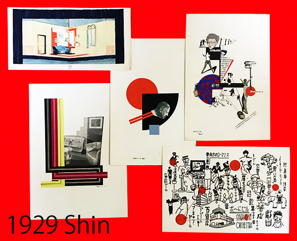 とはいえ、あくまでレトロなデザインとして受容されているのであって、新着品2点目の「Shin」という署名だけに僅かに作者の痕跡を残したデザイン原画 (便箋の表紙、舞台装置などの習作・原画等) は、デザインの根本からして違っていることが分かります。サインの横には小さく年月日が書かれており、ほとんどが1929年か1930年に描かれたものと分かります。