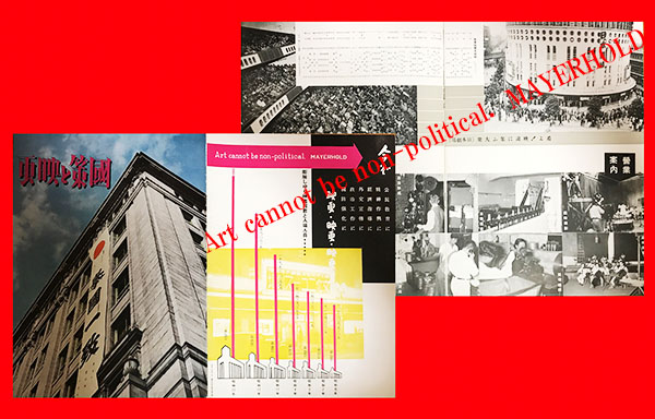 データを視覚的にデザイン化した裏表紙には、「Art cannot non-political」というメイエルホリドの言葉が。当時、日本の国家戦略の主柱の一つだった共産主義革命を背景に登場した演劇確信運動の旗手・メイエルホリドの言葉を、そこだけ突然英文で、何の説明もなく「国策」を掲げたパンフレットに潜ませているところに、当時の映画人=教養人の精一杯の矜持を思います。