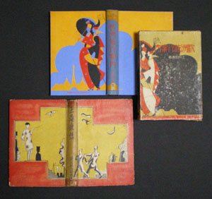 ■これら壁紙の多くもおそらく海外からの輸入かパクリか、とくに後者の可能性を大いに疑うわけですが、しかしそれだって待っているだけでは手に入るはずもなく、先ずは行ってみないことには…という人や、そうでない人にもお役に立ったであろう画像内上『欧州旅行案内』は上村知清著・昭和2年の発行(初版) 。アール・デコ盛んなりし頃の、どこに出しても恥ずかしくないアール・デコ装丁もこれまたパクリか。しかし旅程の効率的な組み方から現地での交通費宿代観光地まで、データを交えた情報量は大変なもの。さしずめ“戦前版・地球の歩き方ヨーロッパ編”とでもいいましょうか。欧州と並び、戦前の日本人が情報を知りたかったのが、やはり大陸・半島・南方の、つまりは植民地として狙っていた地域であり、これらについても旅行案内から研究書・資料集まで盛んに上梓されました。そんななかで、国内都市を題材にして出版されたのと同様に、“都市の裏面”を描いた本というのも人気の高い分野だったようで。井東憲著・昭和4年発行『上海夜話』(初版) もこの系譜にあった一冊。恋の密輸入者、贋造銀貨と支那娘、道楽倶楽部の地下室、没落倶楽部、愛憎美少年記等々、目次には怪しげな見出しが躍っております。装丁は中島松二の手になるもの。今週はこの他、1952年のファッション界の新色・流行色をまとめた『L’OFFICIEL DE LA COULEUR』 (手彩色のファッション・プレート12葉に色見本や生地見本付き、加えて別点冊子もポショワール!仏国製)、猪熊弦一郎の作品が印刷ながらもプレートとして収められた『前奏曲』、エロ・グロ・ナンセンス時代の古本好きには必須アイテム『現代猟奇尖端図鑑』、その当時の“使えるデザイン” 『現代図案カット集』 (…現代?いえ。戦前です)、これも一部のお客様にはお待ちいただいておりました19世紀末から20世紀初頭に出版されたヨーロッパの古い地図やガイドブック、キートンはじめ戦前外国映画スターのポートレート写真などなど、夏枯れの8月を目前に、何故か新着品だけはたぁーぷりでございます。その分、私の懐には寒波到来でございます。 ■企画展の下、「OLD、RARE、UNIQUE」のそのまた下に設けました三つの窓。「PRINTED MATTER」(いわゆる紙モノ)と、「A LA CARTE」(分野でできるだけまとめてアップ)とに、それぞれ少数ながら在庫品をアップし始めました。テーマで組み立てたメニューからお好きなものをどうぞ。というわけで、「A LA CARTE」は「シュルレアリスム」でスタート。ここからダダへ、ドイツ表現主義へ、ロシア・アヴァンギャルドからバレエ・リュスへ、未来派へ、ウィーン分離派へ或いはアーツ・アンド・クラフトへと、暫くはアートとデザインの分野の洋書を中心に時代を遡っていこうか…と壮大なことを考えるばかりでなかなか手とアタマ(何しろ洋書)が追いつかないのが情けない。次回、「A LA~」はエルンストの三大コラージュ・ロマンをアップの予定。「BOOKS」も今後は随時アップしていきたく、「いつ」といえないのが恐縮ながら、時々様子をうかがっていただければ幸いです。あっ。「雑書目録」も更新中。もろもろよろしくお願いいたします! *「A LA CARTE」の先頭位置が、頁のずっと下の方から始まっております。こちらの不具合で見辛く申し訳ございませんが、視線をずすっと下まで下ろしてご高覧いただければ幸甚に存じます。近日中に修正いたします。何卒ご容赦のほど、お願い申し上げます。