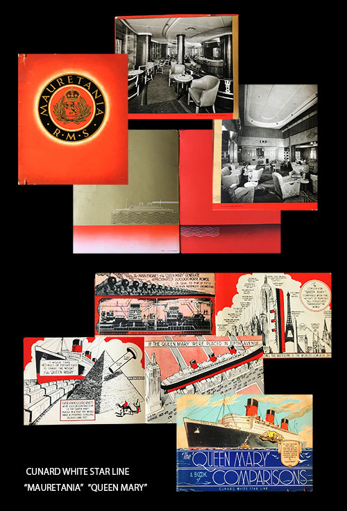 クイーン・メリー号の処女航海は1936年と云いますので、1930年代後半か1940年代初め頃のものでしょうか、ゴージャス感いっぱいのアール・デコの時代から約10年後、約豪華客船をめぐるデザイン表現にもさらなる近代化=大衆化の波が打ち寄せていたようです。