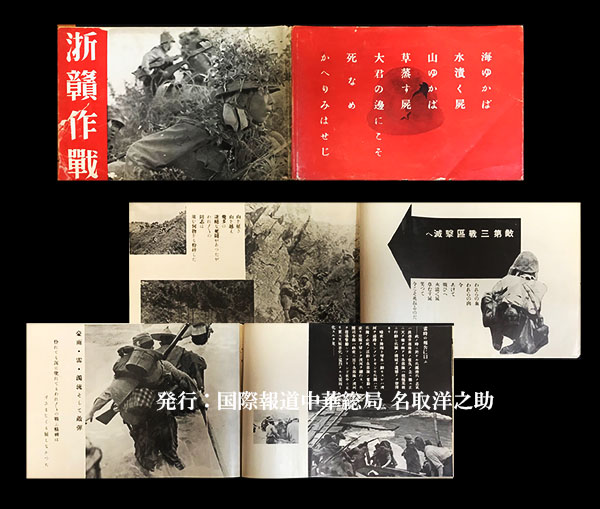 今週の1点目は先の戦争がらみの1冊『浙贛(せっかん)作戦』。中支派遣祭7379部隊報道班編輯、発行人・名取洋之助、国際報道中華総局による昭和18(1943)年発行の初版。横開きの大判で、写真自体のクオリティが高いのはもちろん、切り抜きやフォトモンタージュ、角版断ち落としなど多彩なテクニックを駆使した写真表現からテキストのレイアウトまで、日本工房らしい完成度の高い仕事です。