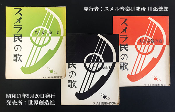 発行は3点とも「スメル音楽研究所」であり、発行者は同研究所の川添紫郎、発売所は西銀座・世界創造社とありますが、作詞・作曲者名については記載なし。