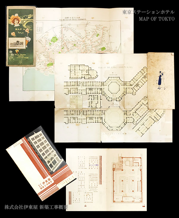 ひとつめの画像中、上の2点は「東京ステーションホテル」のパンフレット。折りたたむと17×5cm程度のポケットサイズとなるもので、表紙を開いた側には東京市電略図が印刷されており、その裏側が「PLAN OF THE TOKYO STATION HOTEL」と題されたホテル全階のフロアガイドとなっています。