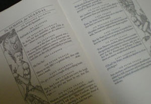 シャネルのように華やかな社交の場に出ることもなく、第二次大戦終結前には実質的に活動を停止したこともあり、日本ではまだまだ知られていないようですが、もっと評価されてしかるべき人物なのですが。話し戻ってこの広告、もちろんオフセット印刷などという荒っぽいことはやっておらず、色別に特色を乗せていったものと思われ、現物の風合いはまたなかなかなよろ……いやその。売りたくなくなるのでこのへんで。 ■お次も洋物。イギリスのプライヴェート・プレスのひとつ、シェイクスピア・ヘッド・プレスによって1930年に発行された『THE SCHOOL FOR SCANDAL』(限定475部) 。背と小口側上下角にヴェラム革をあしらい、背文字は金箔押し、平はグレー地の洋紙にリボンを図案化した反復柄を赤一色で印刷。テキストは1777年に初演された有名な喜劇の台本で、日本では「悪口学校」のタイトルで知られているようです(恥ずかしながら私は知らず…)。挿画はトマス・ロウィンスキーなる人物が手掛けたもので、各章頭には、台本内容に合わせ舞台美術を擬したと思われる図版(無人の舞台を真正面から捉えた格好)を一点ずつ、左右の柱に人物画を配した見開き(画像参照)が10組・計20P、そして登場人物の集合図が扉に一点。いずれもどこか伊坂芳太良を思わせる軽妙さと、いま見ても全く古臭さを感じさせないタッチとで描かれています。けれどやはり、シェイクスピア・ヘッド・プレスといえばカスロンといわれる通り ― この本を美しく見せている最大の手柄は、シンプルかつスマート、つまりは可読性が高く洗練された、書体と組版にあるものと思われます。ケルムスコット・プレスの装飾に過剰を感じ、禁欲的なダブス・プレスには物足りなさを感じるといった方には、多分ちょうどよいバランス感覚でまとめられています。シェイクスピア・ヘッド・プレス。私は結構気に入っています。 ■台風の去り際(だといいのだけれど)に出かける金曜日の市場、そして土曜日の市場は…さてさてどうするどうなるワケ分からずその結末はまた来週初めにでも改めて。