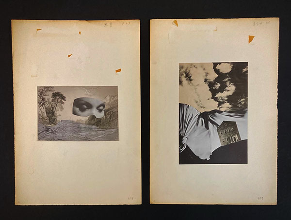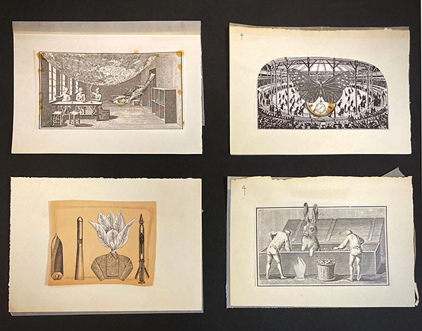 素材はいずれも雑誌や新聞等、19世紀末~20世紀初頭の印刷物の現物を利用したようですが、なかには拡大倍率や画質をこまやかに考慮してか、古い銅版画を写真の印画紙にプリントして、その上にコラージュを施したものなども。