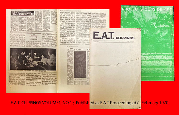 ■「9evenings」のパンフと同型のタブロイド版冊子『E.A.T. CLIPPINGS』は定期刊行誌『E.T.V. Proceedings』の第7号として発行された特別号の第一巻第一号。米欧中心に南米から日本まで、1960年から1969年までの間に世界各地で報道・批評・レポートされた記事のクリッピングからなる雑誌。日本のメディァでは『みずゑ』と『美術手帖』から記事がピックアップされています。「E.A.V」はExperiments in Art and Technology(芸術と科学技術の実験)の略でアートとテクノロジーの融合を目指したアメリカの前衛芸術家組織。「9evenings」を制作している過程で生まれたグループであり、1966年に設立、68年にはクルーバーが代表となり、「現代アーティストなら誰でも利用できる材料、技術、工学」を実現するために、全米に28のE.A.T.支部が設立されたと云います。「日本大百科全書」を見ると、E.A.T.については、マサチューセッツ工科大学先端視覚研究センターとの関係、大阪万博(ペプシ館!)への関与から、アートと技術の関係まで、例えば下記のような興味深い記述が並んでいます。何だかとても今日的なお話しでもあるような。すでに再評価が始まっているらしいE.T.A.にご興味をお持ちになったら下記のサイトをお勧めします。動画付きも。