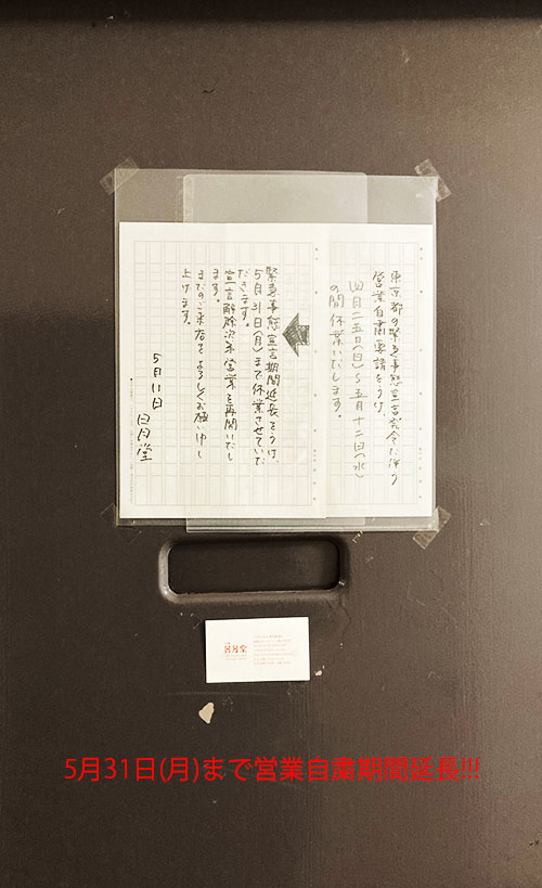 ■都の営業自粛要請を伴う非常事態宣言の期間延長をうけ、店の休業期間を5月31日(月)まで延長させていただきます。