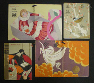 またこれと同じクチで1923年発行の高級婦人月刊誌『ART・GOUT・BEAUTE』3冊も入荷。残念ながらムレ・水シミなどダメージが大きく、こちらは破格値で出す予定。ポショワールのスタイル画多数を所収しているので、考え方・使い方によってはかなりおトクです。 ■続いて下の画像、日本で最初の百貨店・三越発行のPR誌でその名もそのまま『三越』。昭和4年から6年にかけ月刊で発行された内の21冊が一括入荷。長い発行歴のあった同誌でも、表紙のデザイン・内容ともに、一番充実していた時代ではないでしょうか。画像のなかでペガサスの表紙は杉浦非水、クリスマス号に相応しく、西洋人形が箱に入ったイラストは新本勝。目次をちょっと眺めれば北村兼子、松野一夫、巌谷小波、江見水陰といった名前を拾うことができ、しかもモダンな商品の数々がこの当時としては再現性の高い写真で紹介されており…。確かに、古書好き、モダニズム研究に関係する方たちに、よく知られているのも頷ける内容。その月のカレンダーが印刷された厚紙が入っているものも多く、このカレンダーに各種商品の陳列(フェア)や展覧会のスケジュールがびっしり並んでいるところなどは、パリの百貨店が盛んに発行した「アジャンダ」の発想にも似ているようです。いまも昔も、洋の東西を問わず、モノを売るために人は実にさまざまなことを考えてきたものだと感心するわけですが、だからといって古本屋が機械部品を売っていいのかしらと未だに疑問を抱えつつしかしダンボール箱1箱…(…→と冒頭に戻って仕事は続く。そして来週の予定はさらにその上のinformationをご高覧のほどお願い申し上げます)。