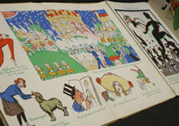 ■来週には陳列・初日だというのに、ここにきて買ってしまったダンボール1箱。「町工場」展への準備は搬入直前まで続きますが、そちらと店で扱う商品では―とくに今回―全然別でありまして、こちらは店頭新着品のご紹介。最初の画像はパリのレビュー小屋(ミュージック・ホール) 「カジノ・ド・パリ」が発行した『LA REVUE DU CASINO DE PARIS―ON DIT CA・・・』。レビュー華やかなりし頃の舞台の情景・出し物やスターたちの姿を、全てイラストで表現したもので、イラストレーターとして「A Barrere」の名前が記されています。表紙のみならず中面・折丁仕立ての12Pが、全てカラー石版刷り。さすがは。1930年代にはパリのこの手の店のなかでも最高級店と称せられただけのことはあります。カンカンはもちろんコミカルな群舞、スパニッシュ・ダンス、黒人レビュー、シュレンマー風の衣裳を着けた踊り手、果ては水槽のなか半裸で踊る美女やらキューピーの隊列(かぶりもの…?)までが並ぶ賑やかさ。さぁて全体を眺めてみるかと折丁全部広げてみれば……約3m40cm。店でもこうしてお見せできれば楽しかろうと思ったものの、何しろ三歩で行き止まりの小店、ぜーんぜん収まらないのでした。奥付がないので年代の特定の難しいところですが、贅沢なつくりの一方で、ミスタンゲットの扱いが小さくかつジョセフィン・ベーカーの名前が出てこないことなどから、第一次大戦終結以降、1930年に入るまでの間に発行されたものではないかと(あくまで推測)。