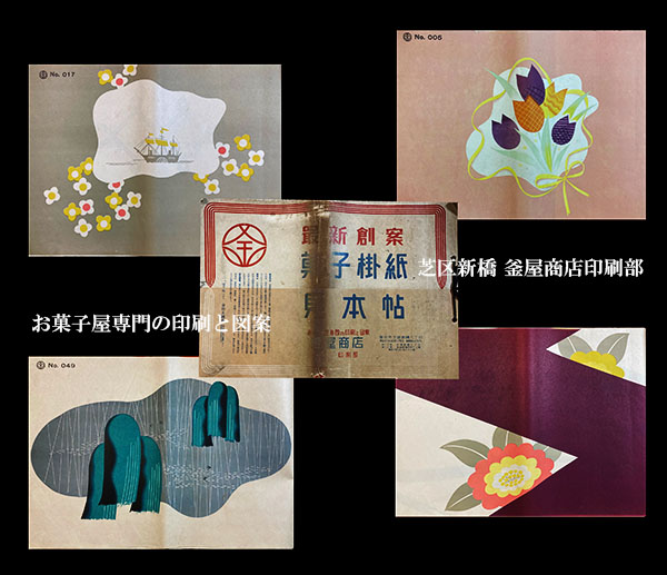 ■と、書き始めた流れもあり、こんなのまで商品になるのかというのが1点目。町のお菓子屋さんに消耗品を卸していた専門店「釜屋商店」印刷部による「掛紙」の見本帖。「東京市芝区新橋」の住所表記、デザインの傾向や紙質、また、表紙のご挨拶文に「今回第一回の作品を数十種発表いたします」とあることなどから、戦後のもので、1947年頃までのごく限られた時代に作られ使われたものと見られます。