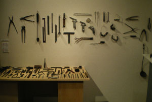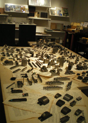 ■いよいよ本日、10月12日(金)より、企画展「2007.東京.町工場より」が始まります。陳列は粛々と進行し、一方、手を動かしながらも私の頭のなかは例によって混乱を来たし、それでもとりあえず、幕を開ける格好は整えられました。混乱を来たしたのは主に古本・紙モノのに起因いたしまして、「印刷解体」などに比べると淋しさは否めず、何で「アレ」を持ってこなかったのだろーか、とか、「レイ」のぶつはいずこへ、とか、いまさら考えたところで遅いというものでしょう。会期が長いこともあり、できれば来週にはまた追加投入したいものです。しかし今回、主役は何といっても「機械部品」と「工具」です。この週末にお出掛けの皆様には是非、そちらを重点的にご高覧いただけますよう、心よりお願い申し上げます。 ■開始前から早々に…本当にすみません。お詫びが数件。一部の告知情報で、解体直前の町工場で撮影した300カットの写真を展示”と紹介されておりますが、展示スペースの都合により、撮影した約300カットから、相当に数を絞っての展示となりました。