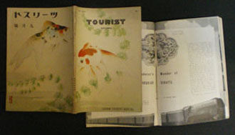 ■次の画像は日本旅行協会(JAPAN TOURIST BUREAU)発行の月刊誌、『ツーリスト(TOURIST)』。画像は昭和10年発行の二冊ですが、六冊が入荷いたします。この雑誌、表側からは日本語版、通常裏表紙になる側からは英語版という、両A面雑誌。英語版は単に日本語版のテキストを訳したというのではなく、グラビア頁の写真から特集や記事まで、日英各々異なる丁寧な編集です。一見、テキストに偏重した雑誌に見えますが、目次頁に写真のコラージュをあしらうなどグラビアにはなかなか見るべきところも多く、特に英語版では満州や朝鮮など旧植民地の風景が活写されています。また、英語版の巻頭には、全て一色の扱いながら内外の鉄道、客船、銀行など旅行に関わる企業の広告も多数あり、とくに南満州鉄道の広告の出来はさすがです(ちなみに画像の二冊の内、モノクロ見開きは「アジア号」の写真と記事)。日本語版をざっと眺めたところでは、月刊誌らしく「観光ニウス(=ニュース)」の伯林オリンピック日程や「流線型特急シティ・オブ・ポートランド号」の図入り案内など、全体に最新情報や季節に合わせた実用情報がよく拾われている印象があります。面白いのがフランス人とドイツ人の記者に東京でのお気に入りを聞いたインタビューで……日本のカフェーをフランス人は静かだといいドイツ人は騒々しいと云い、フランス人もドイツ人も今と変わらず鮨と天ぷらが好きで意外におでんも人気があり、映画館では日比谷、帝国、帝都、芝園がよろしく、踊りにいくなら外国人は「フロリダ」だヨ、吉原は本で知ったのと比べると実際は存外詰まらないネ、日本語が分からない外人が芸者を呼んだら勝手に高くされちゃうヨ…とまぁネタの宝庫のような。何のネタかはおくとして。他の4冊がどんなものだか、これは来週のお楽しみ。というのも今週土曜日が祭日のため、新着品の到着は火曜日となりますのでご注意ください。新着品はこの他、戦前の外国絵葉書が1箱とファイル7冊分、1950~60年代の海外ツアーパンフ約30点、『満州産業事情』等満州関係6冊、『独逸大観』等戦中独逸関係書6冊、『モダン用語辞典』『新外来語辞典』等戦前の流行尖端語辞典9冊、その他紙モノなども店に入ります。まだ積まれたままの機械部品…店主「ほらほらとっとと片付けなさいよっ(怒)」。店員「はい!ただいま」。ってこれがどちらも私なもので。