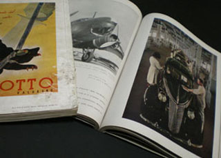 ■今週に続き、店は来週も少々流動的なスケジュール。火・木曜日は通常の12時~20時ですが、土曜日は15時半頃からの営業とさせていただきます。二週続いて面倒なことになって、本当に申し訳ございません。来週は、土曜日だけはくれぐれもご注意を…。 ■今週もドイツ語版『CASSANDRE』、ぬやま・ひろし(=西沢隆二)が編集に関わり、木村伊兵衛がグラビア監修を務めた『グラフわかもの』 (珍品!)の1本口、着物の柄見本帳2点、小店としては珍しい(たまには売れそうなものも買わないとね。なんて思って買ったものに限って売れないのも分かっていながらあぁあ買ってしまった)金子国義の銅版画2点などなど、“新着品入荷!”といえる落札点数だけは何とかクリアできたようです。では早速そんななかから。最初の画像は1930~40年代初めにイタリアで出版されたグラビア雑誌4冊の内の二点、1940・41年発行の『LA RIVISTA』です。版型など一見したところフランスの『リリュストラシオン』に似た印象がありますが、さすがに戦時色が前面に打ち出され、画像左側の一冊は巻頭特集に三国同盟各国とその支配下に置かれた地域のレポートを置いています。もちろん、ドイツの頁にはヒットラーの姿が堂々と…。右の一冊は「フィアット」社の特集記事から拾った画像ですが、あの第三インターナショナル塔まがいのオブジェ建築やら斜めストライプ塗装の施された賑々しいスペイン館などが並ぶミラノの見本市の特集、機械をクローズアップし、しかも大胆なカラー処理を施したアヴァンギャルドなグラビア・ド迫力の1P大など、これ以外にも実に見所の多い一冊。さすがは戦中も前衛を否定しなかったイタリア、といったところでしょうか。三国同盟当時の日本ではナチス・ドイツびいきばかりが目立ち、それを引きずるかのように当時のイタリアに目を配る人はいまだに少ないようですが、戦時体制下のグラビア表現ということでは、イタリアも“見るべき価値”充分ありと見ました。