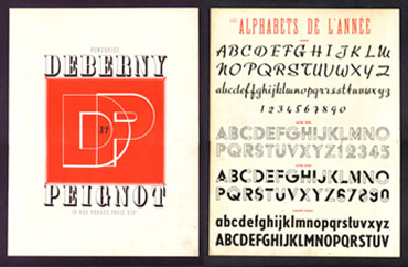 ■新着品のその前に。11月17日(土)は所用のため、店は15:30頃からの営業となります。恐縮ですが、ご注意ください。来週は火・木・土曜の各日12:00~20:00で営業いたします。ご来店のほど、何卒よろしくお願いいたします。 ■今週は古典籍の入札会を除いて神田の市場はお休み。新着品は先週土曜日の五反田の市場の落札品と、自宅でぼちぼち整理している紙モノからとなります。画像上は、フランスの活字鋳造所ドゥベルニ・エ・ペニョ(DEBERNY ET PEIGNOT)社の『今年のフルァベット(LES ALPHABETS DE L’ANNEE)』。つまり新作書体をセールスするために刷られた広告であり、活字見本を兼ねたペラもの(厚めの紙に両面刷り 画像は表と裏)。紹介されている書体は上から「スクリブ」「アシェ・グリ」「アシェ・ノワール」「ユーロプ・エトロワ」の4書体で、1936年頃のものではないかと思われます。「アシェ」体はいずれもカッサンドルのデザインした書体として比較的知られているものでしょう。1937年にはその代表作・ペニョ体を開発するなど、この当時からタイポグラフィの仕事に充実した成果を残しています。カッサンドルといえば先ずはポスターの仕事があげられますが、そこに展開された大胆なパースペクティブは、彼が元来、イラストレーターというより設計家の才能に恵まれていたことを物語るようでもあり、書体の開発に関心が向かったのも自然な流れだったのかも知れません。カッサンドルが作り出した活字は、よくも悪くも時流を反映したものだったために、例えば同じペニョ社が生んだ「ユニヴァース」のような普遍性はもち得なかったようです。書体のデザインとは彼ほどの天才にしても成し難しいものなのでしょうか。いま、パソコン上では実に様々なフォントを使うことができますが、しかしこのなかで生き残っていくものは、活字の時代に鍛え上げられ、基礎をかたち作られたものだけではないかと思うことがあります。